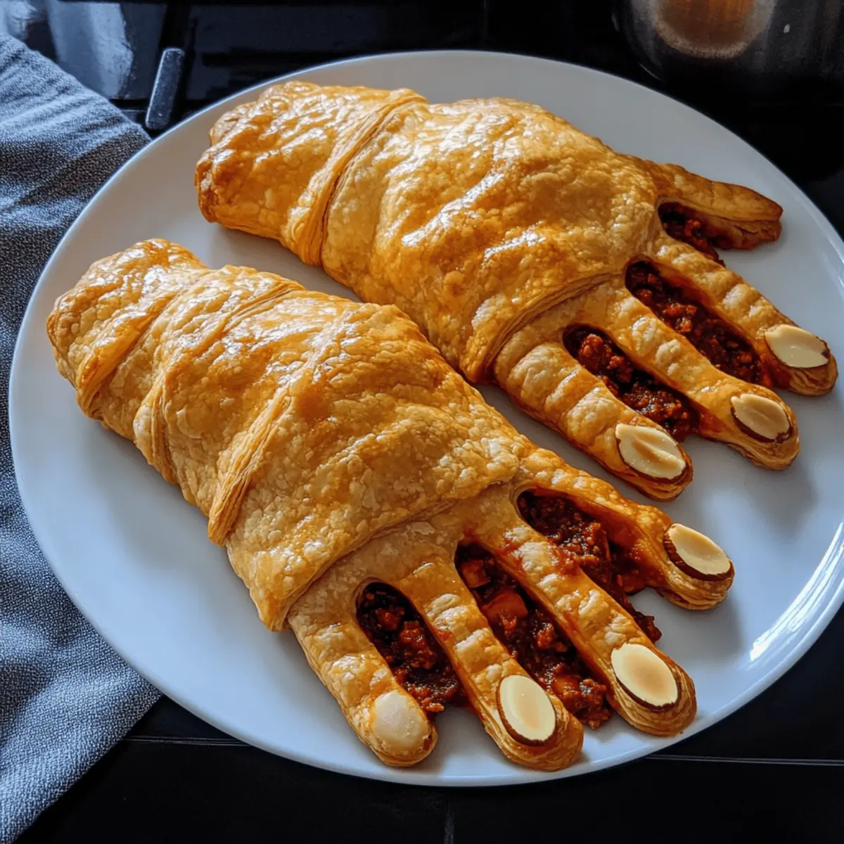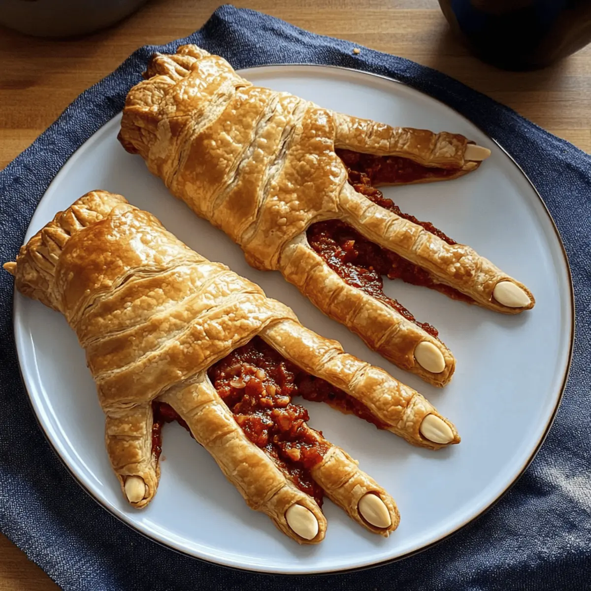Blätterteighände mit Tomaten-Fleischfüllung für Halloween