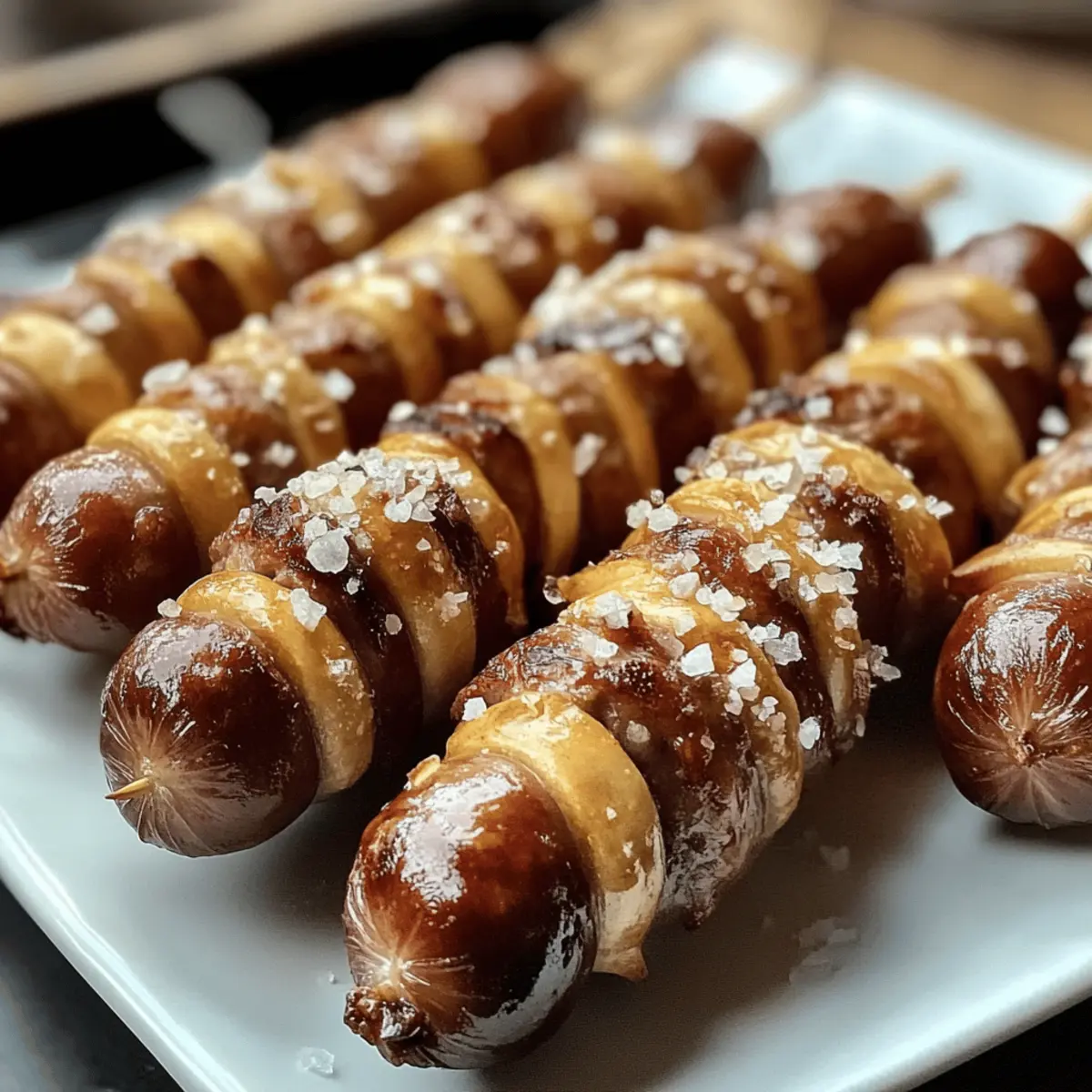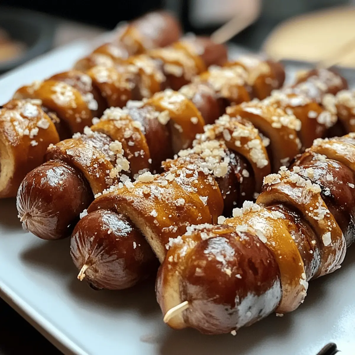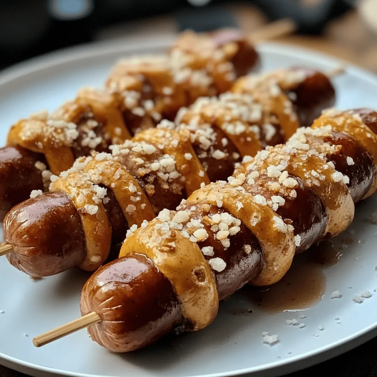 Köstliche Bratwurst-Laugen-Spieße, perfekt für Grillabende und Familienfeiern. Einfach zuzubereiten und unwiderstehlich knusprig.