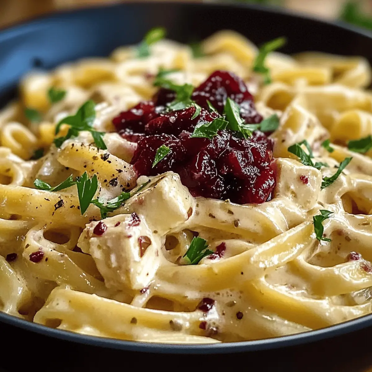 Verteile die Brie Pasta mit Preiselbeeren Kompott auf vorgewärmte Teller. Garniere das Gericht mit frisch gehackter Petersilie für einen frischen Farbtupfer. Optional kannst du etwas geriebenen Parmesan darüber streuen, um zusätzlichen Geschmack zu verleihen. Serviere die Pasta sofort, sodass sie warm und cremig genossen werden kann.