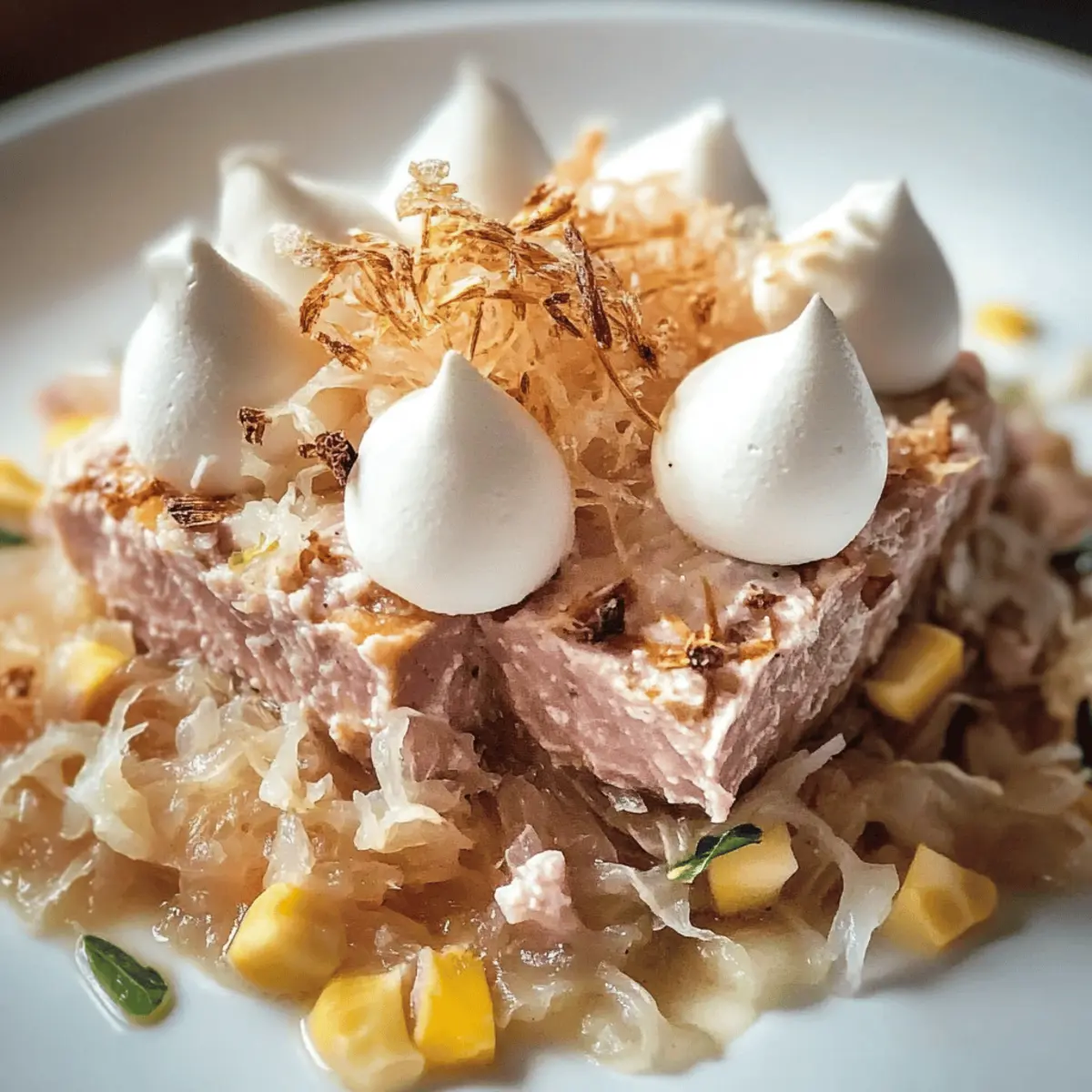 - Richte die Choucroute warm auf Tellern an und garniere mit den knusprigen Baisers.
