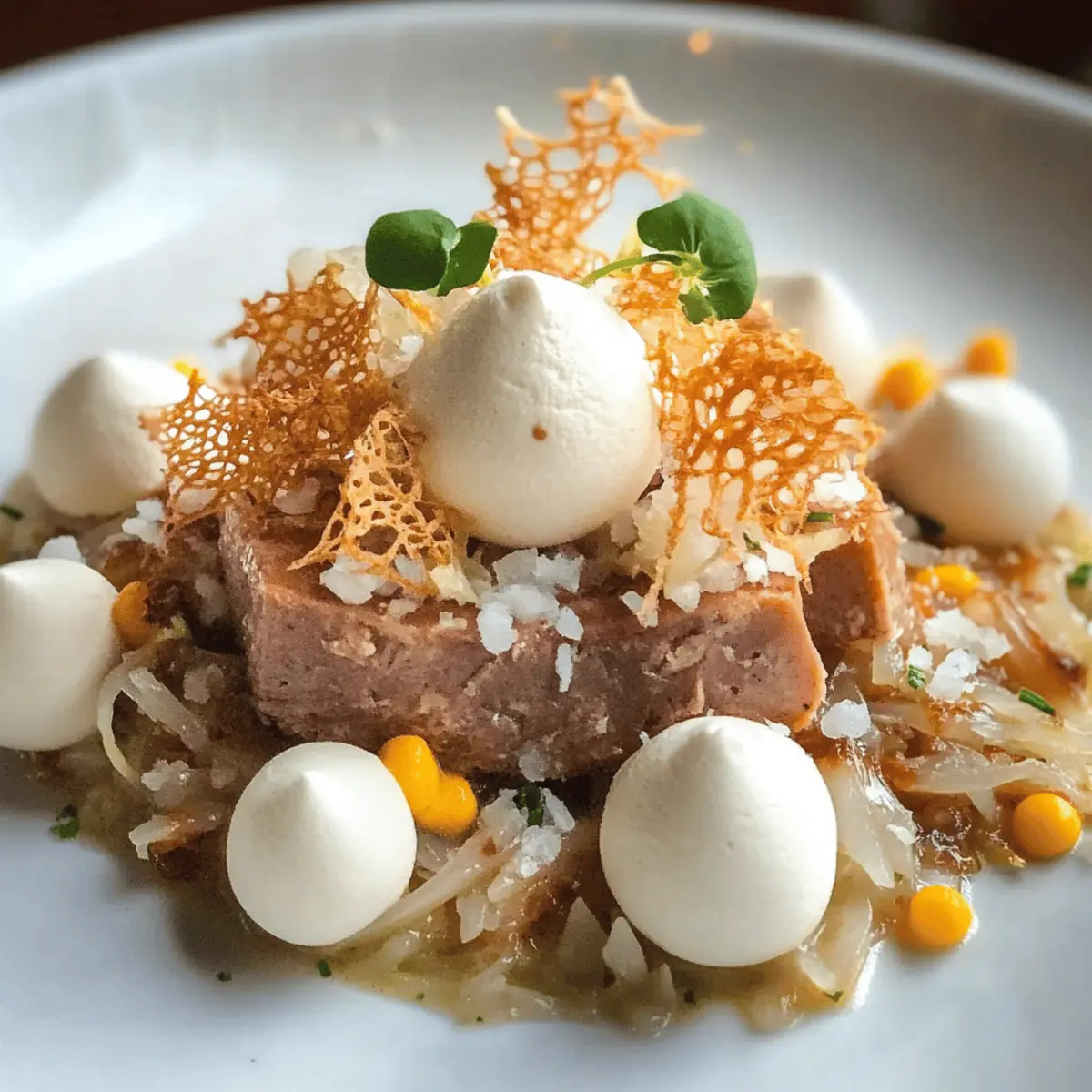 Sobald die Choucroute fertig ist, richte sie warm auf Tellern an. Platziere einige Löffel der cremigen Leberpastete auf der Choucroute, um einen reichhaltigen Kontrast zu schaffen. Garniere das Ganze großzügig mit den knusprigen Baisers für eine aufregende Textur und überraschende Geschmacksnuancen.