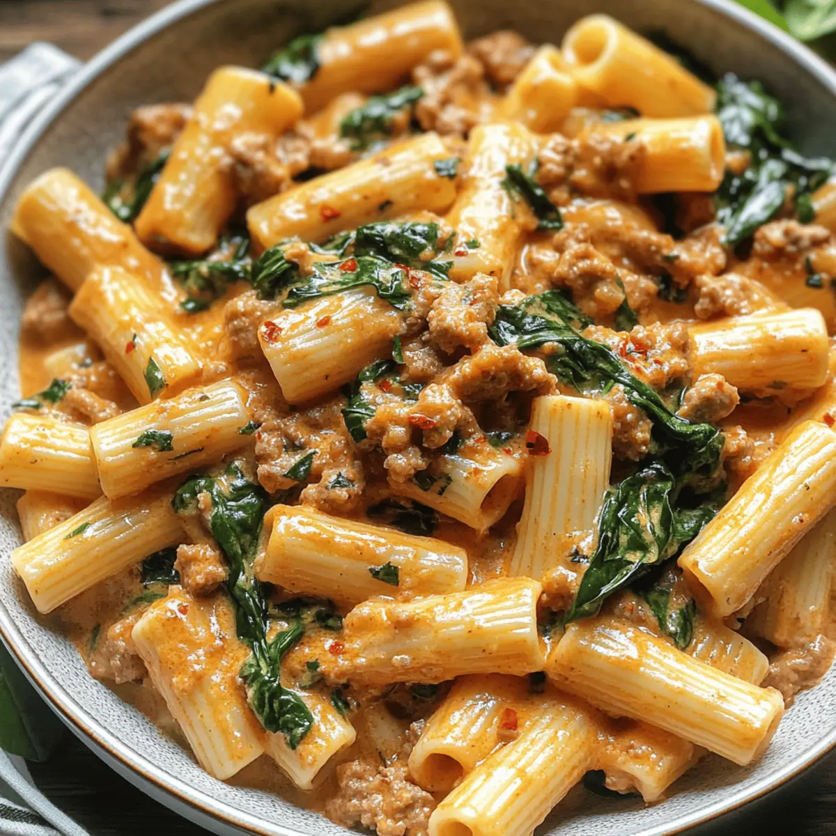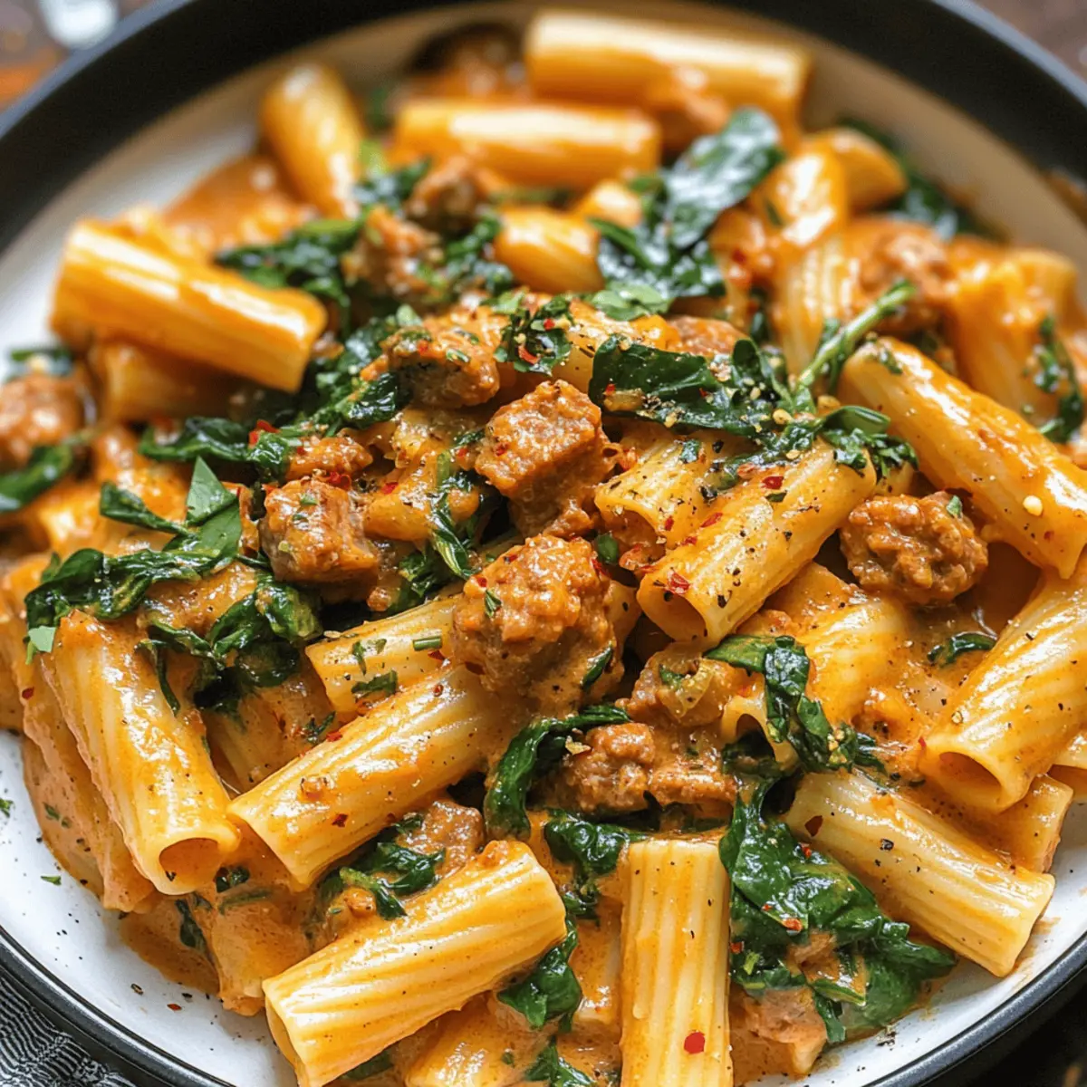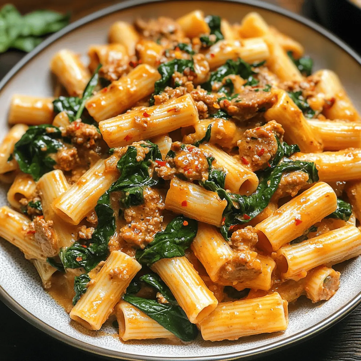 Sobald die Pasta gar ist, gib den frischen Spinat dazu und rühre um, bis er 2-3 Minuten lang zusammenfällt. Die lebendige grüne Farbe des Spinats wird nicht nur gut aussehen, sondern auch zusätzliche Nährstoffe in deine cremige Wurst Rigatoni bringen.