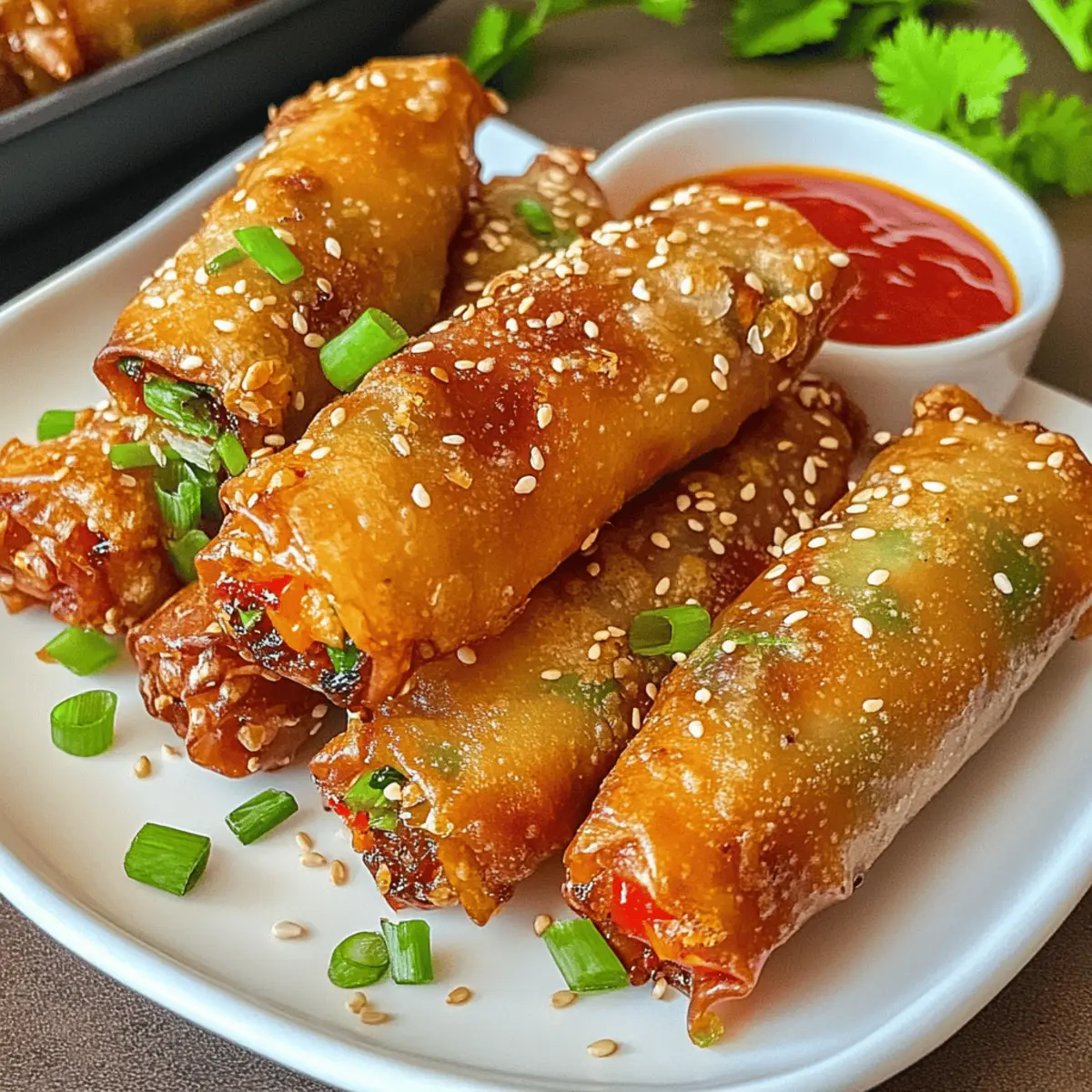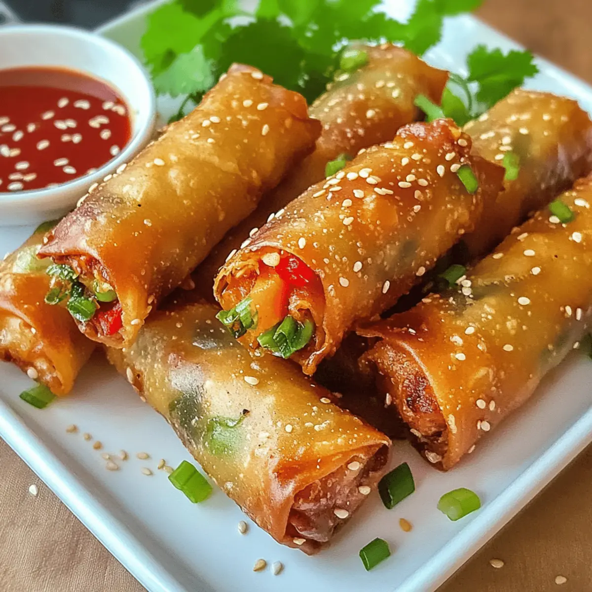 Nehme die heißen Frühlingsrollen aus dem Airfryer und streue geröstete Sesamkörner sowie gehackte Frühlingszwiebeln darüber. Serviere sie sofort mit einer süß-sauren Sauce oder deinem Lieblingsdip. Diese Crispy Frühlingsrollen sind perfekt für jeden Anlass und werden deine Gäste begeistern!