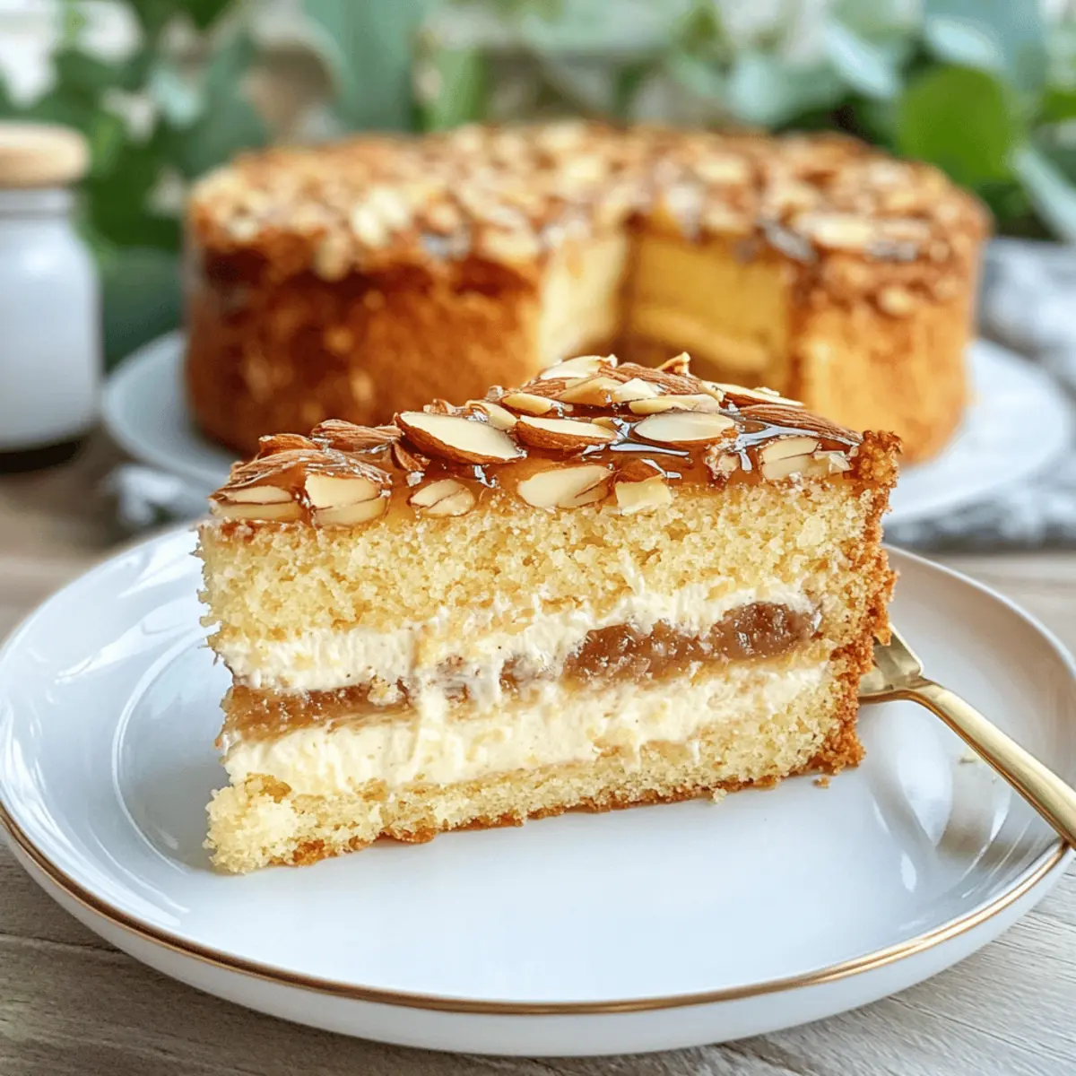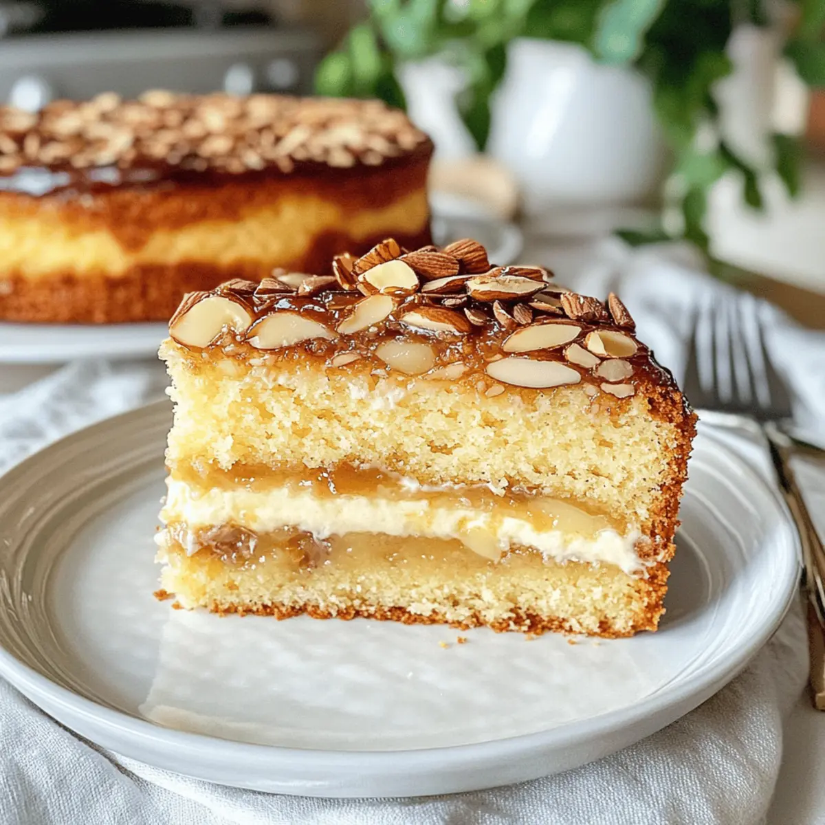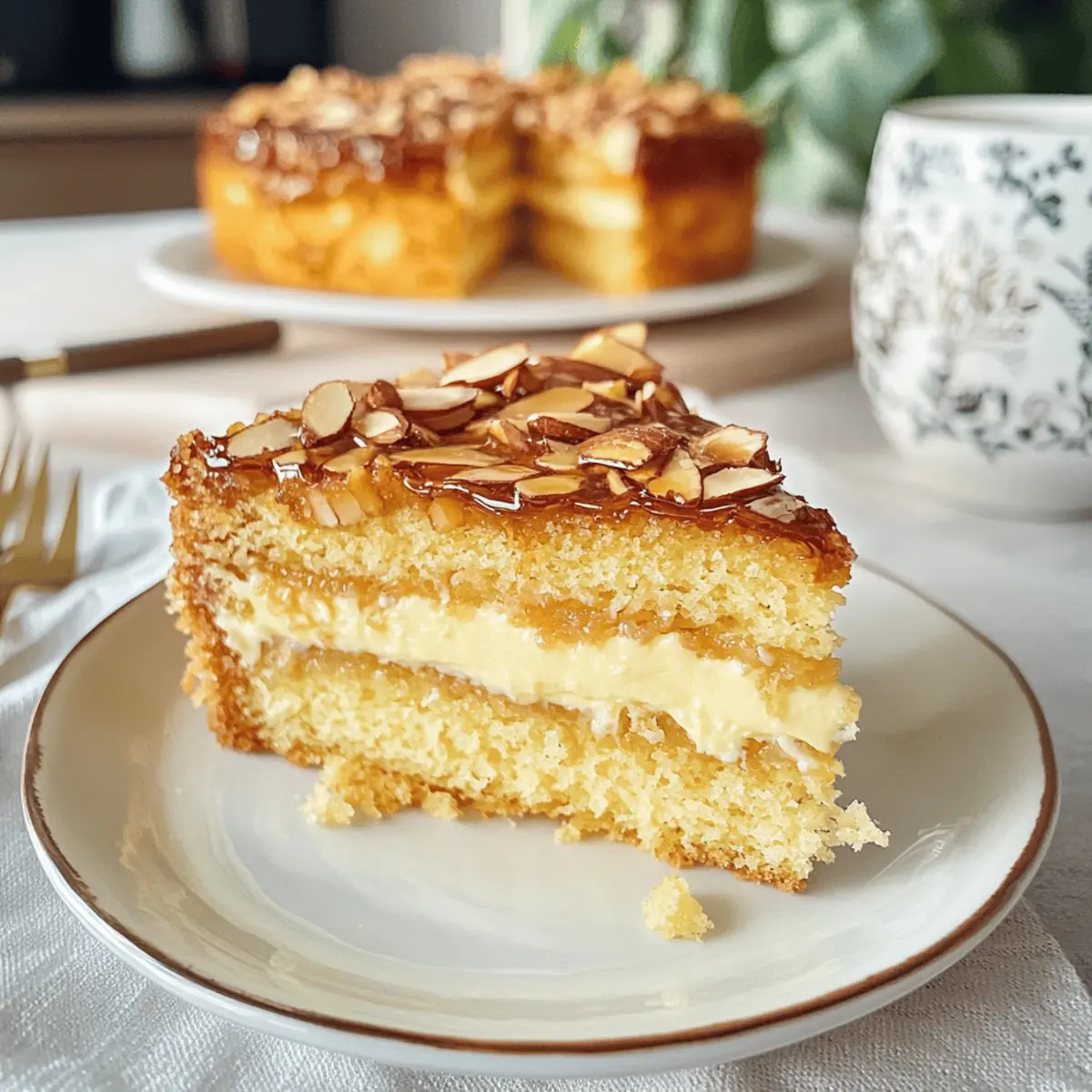 Genussvolle Texturen: Die Kombination aus fluffigem Biskuit, knuspriger Mandelschicht und cremiger Füllung zaubert eine perfekte Harmonie, die beim ersten Biss überzeugt.