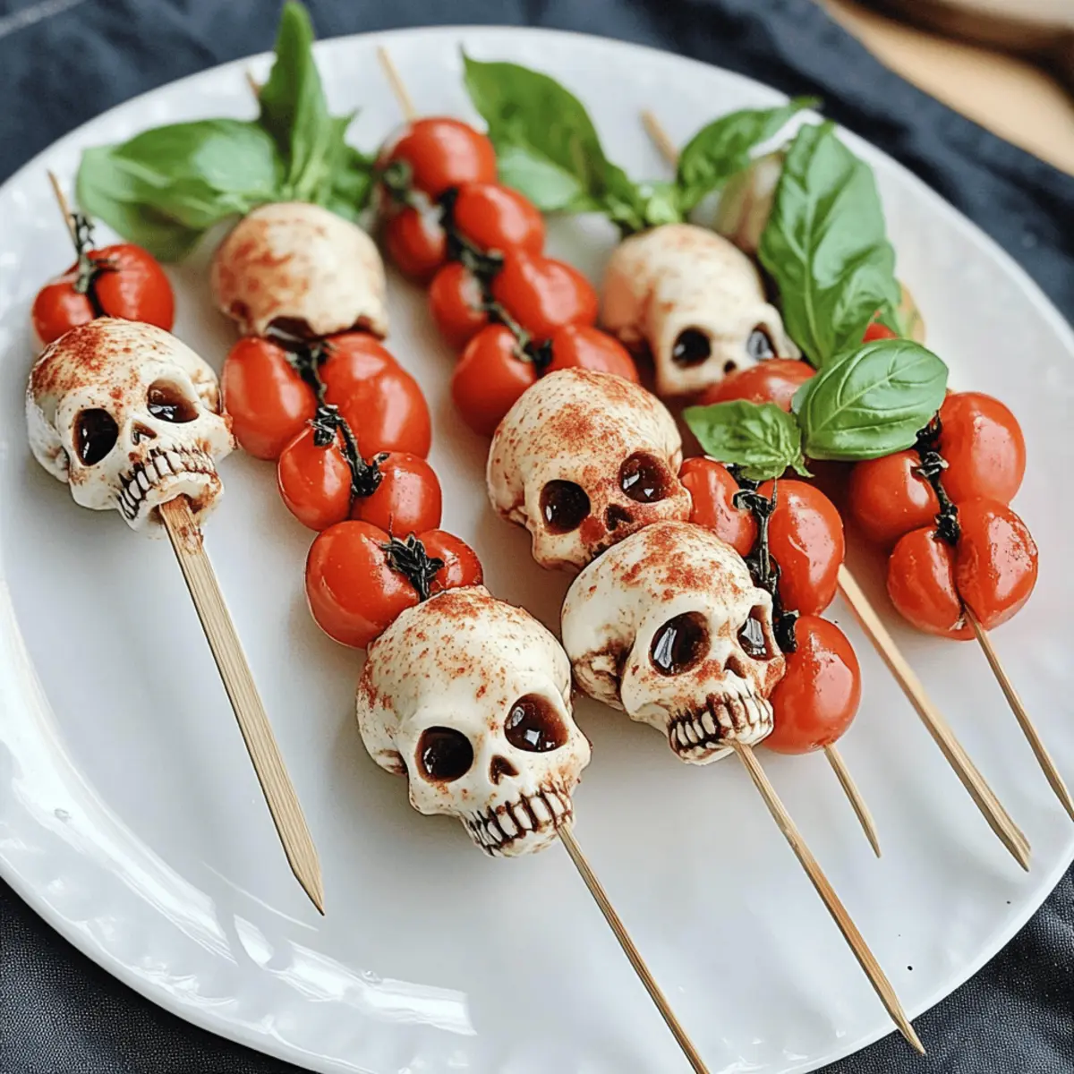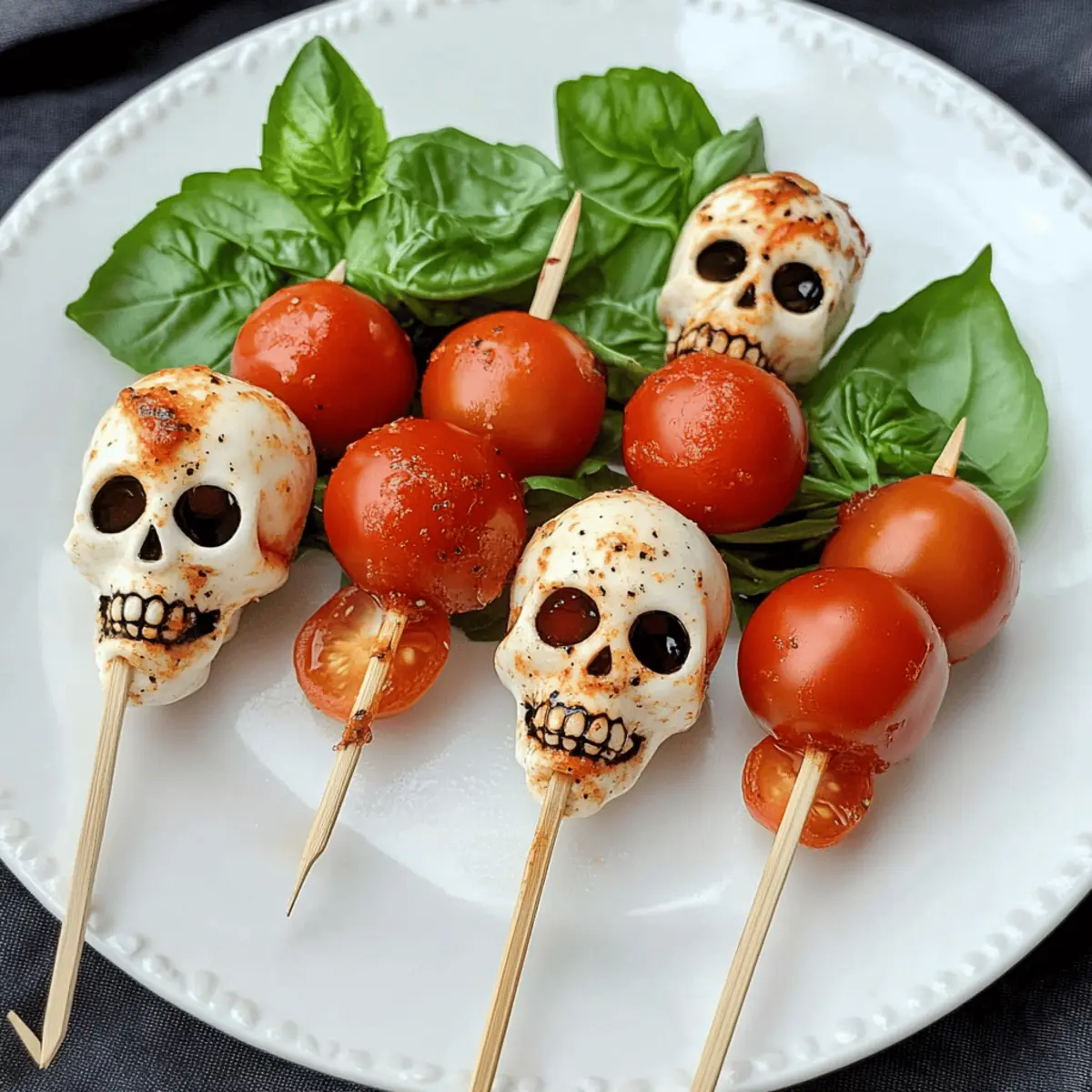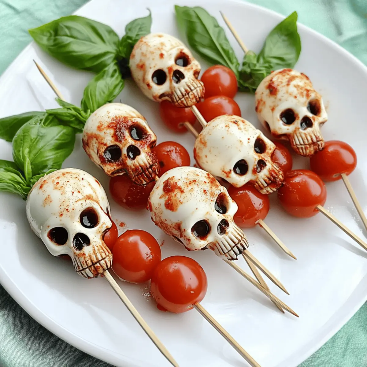 Entdecke die schaurigen Halloween Caprese-Salatspieße, die einfach zuzubereiten und gesund sind.