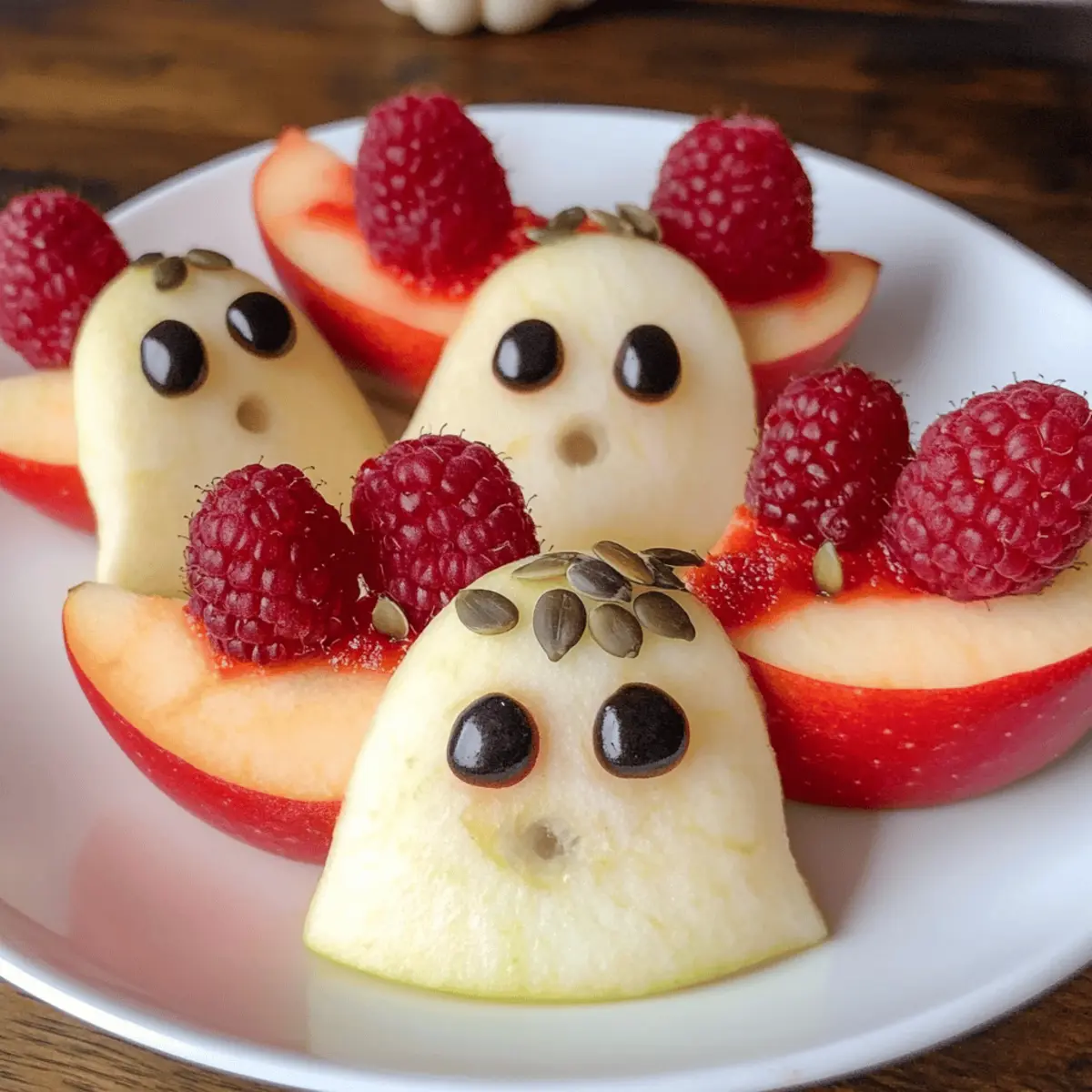 - Die Geister zusammensetzen: Apfelspalten mit Himbeeren dekorieren.