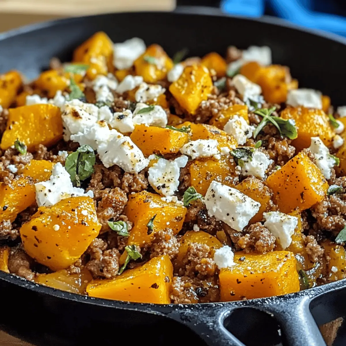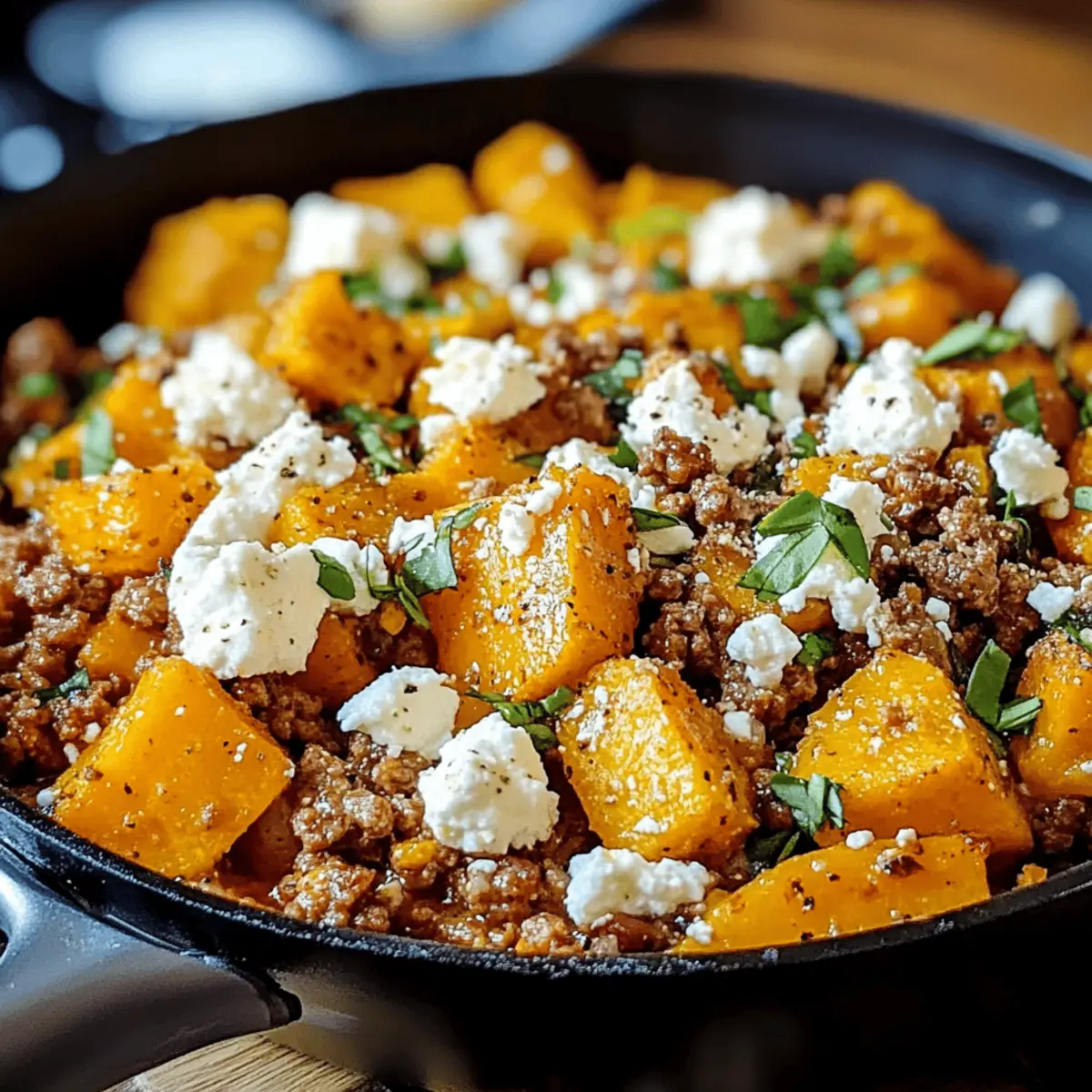 - Feta gleichmäßig verteilen: Zerbrösele den Feta gleichmäßig über dem Gericht, um sicherzustellen, dass seine salzige, cremige Note in jedem Bissen der Kürbis Hackfleisch Pfanne mit Feta spürbar ist.