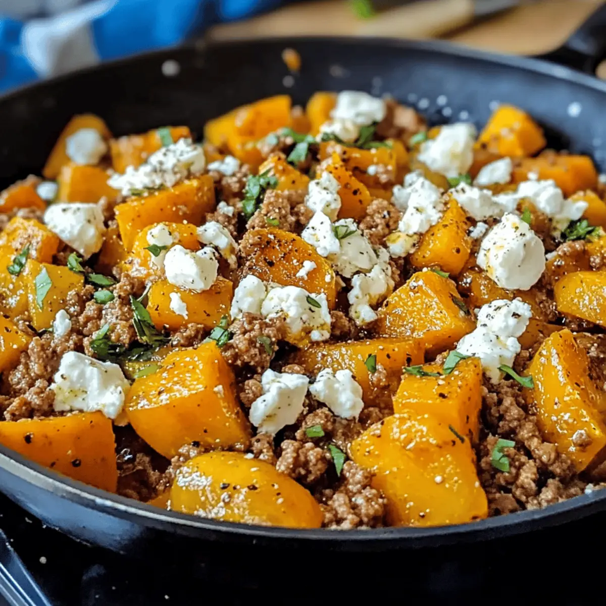 Die Kürbis Hackfleisch Pfanne mit Feta lässt sich wunderbar im Voraus zubereiten, was sie ideal für hektische Wochentage macht! Du kannst den Kürbis, die Zwiebel und den Knoblauch bereits bis zu 24 Stunden vorher schneiden und in einem luftdichten Behälter im Kühlschrank aufbewahren, um Zeit zu sparen. Auch die Gewürze kannst du im Voraus abmessen und bereitstellen. Wenn du bereit bist, das Gericht zuzubereiten, brate einfach die vorbereiteten Zutaten in einem heißen, antihaftbeschichteten Skillet an, koche das Hackfleisch und füge schließlich den Kürbis und den Feta hinzu. Achte darauf, dass du das Gemüse nicht zu lange kochst, um die zarte Textur zu erhalten, die das Gericht so lecker macht. Mit diesen einfachen Vorbereitungen sparst du wertvolle Zeit, ohne auf den köstlichen Geschmack zu verzichten!