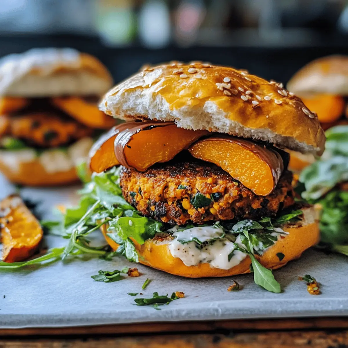 Nimm die Kürbis-Zwiebel-Burger-Brötchen und schneide sie auf. Fülle jedes Brötchen mit einem Linsen-Pattie, garniere sie mit gerösteten Kürbisscheiben, frischem Salat und deinen Lieblingssaucen. So entsteht ein köstlicher und gesunder Burger, ideal für die herbstliche Saison.