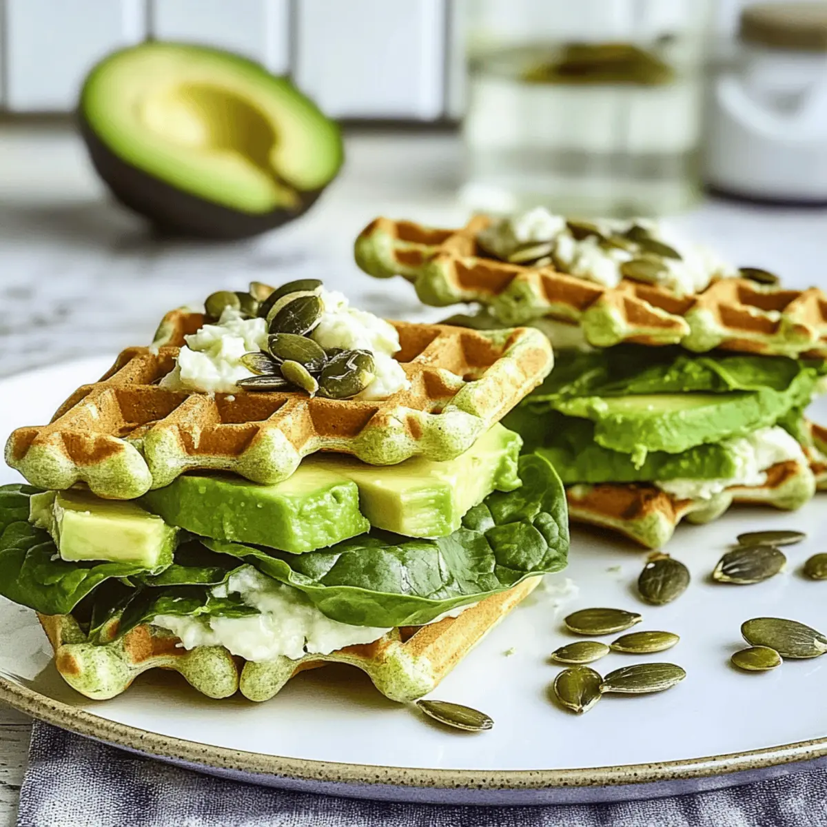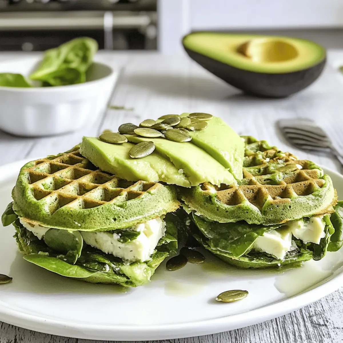 - Zusammensetzen Sie die Sandwiches, indem Sie eine Waffel mit Avocado, gerösteten Kürbiskernen und Spinat belegen und mit einer zweiten Waffel abdecken.
