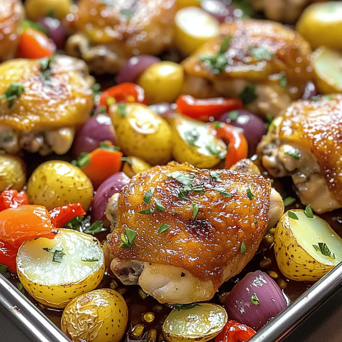 4. Belege ein Backblech mit den marinierten Hähnchenschenkeln und verteile das Gemüse gleichmäßig darum.