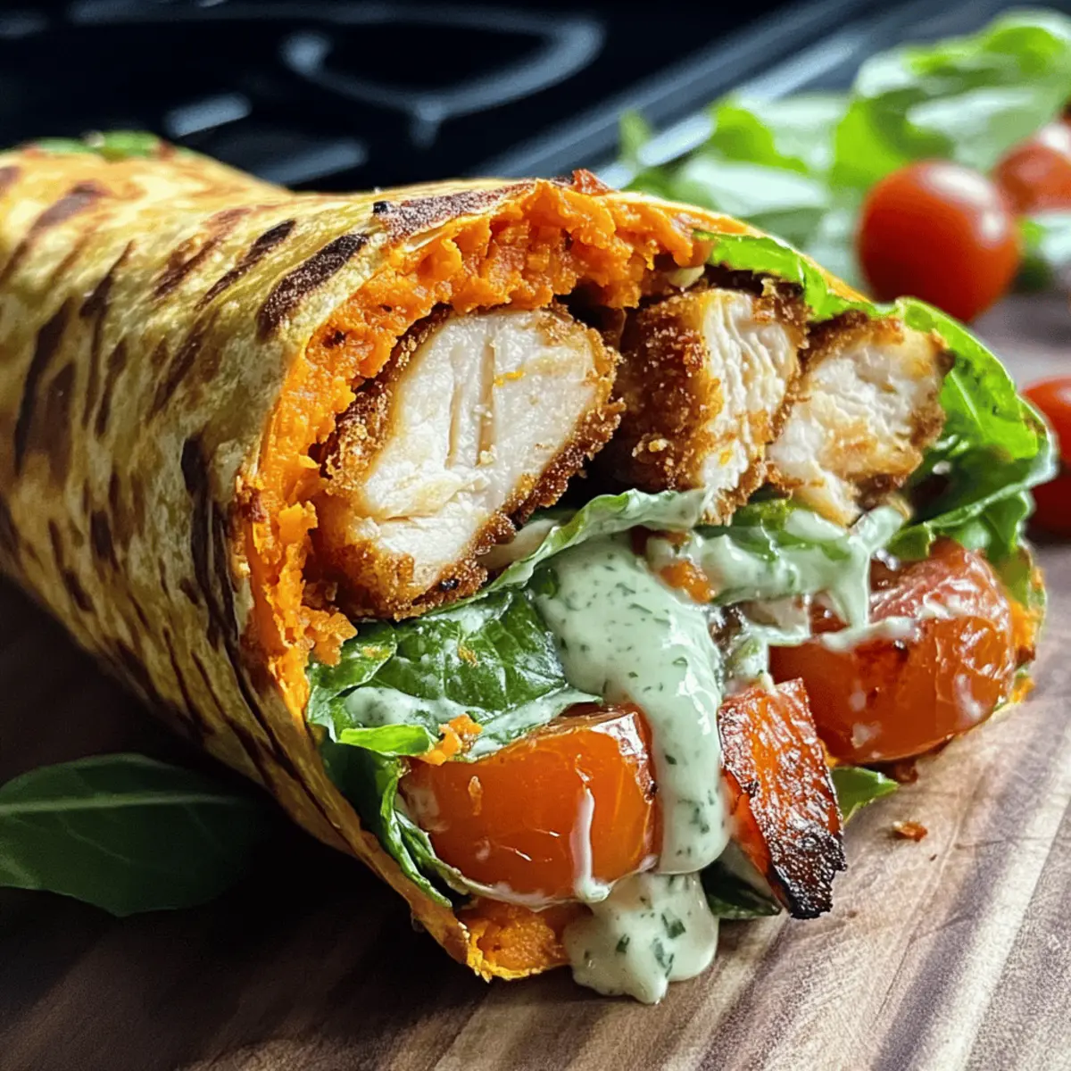 • Vegetarische Option: Tausche das Hähnchen gegen sautierte Champignons oder knusprigen Tofu aus. So erhält der Wrap eine herzhafte und fleischlose Note.