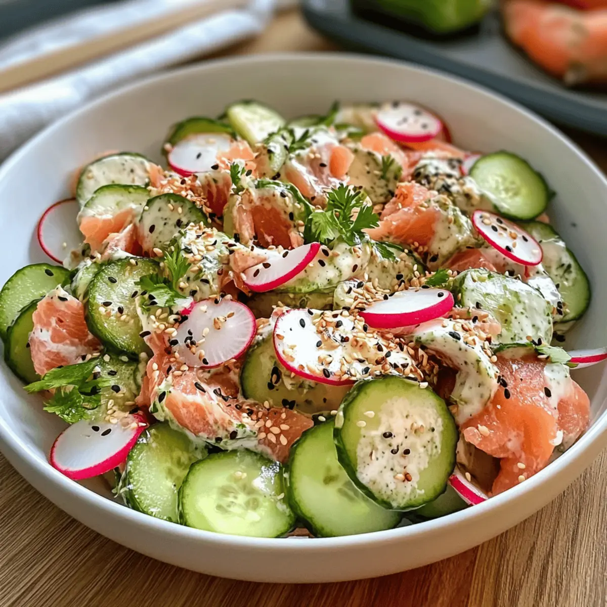 Der Sushi-Salat mit Stremellachs ist ideal für die Meal Prep, da du die meisten Zutaten bis zu 24 Stunden im Voraus vorbereiten kannst. Beginne damit, die Gurke und Radieschen dünn zu schneiden und sie in einer Schüssel mit etwas Salz zu vermengen – das entzieht überschüssige Feuchtigkeit und erhält die Frische. Auch die rote Zwiebel und den Stremellachs kannst du bereits am Vortag vorbereiten, damit die Aromen gut durchziehen. Achte darauf, die Zutaten in luftdichten Behältern im Kühlschrank aufzubewahren, um ihre Qualität zu bewahren. Wenn du bereit bist zu genießen, mische einfach das fertige Dressing bei und serviere den Salat frisch. So sparst du wertvolle Zeit während der Woche und hast trotzdem eine köstliche, erfrischende Mahlzeit parat!