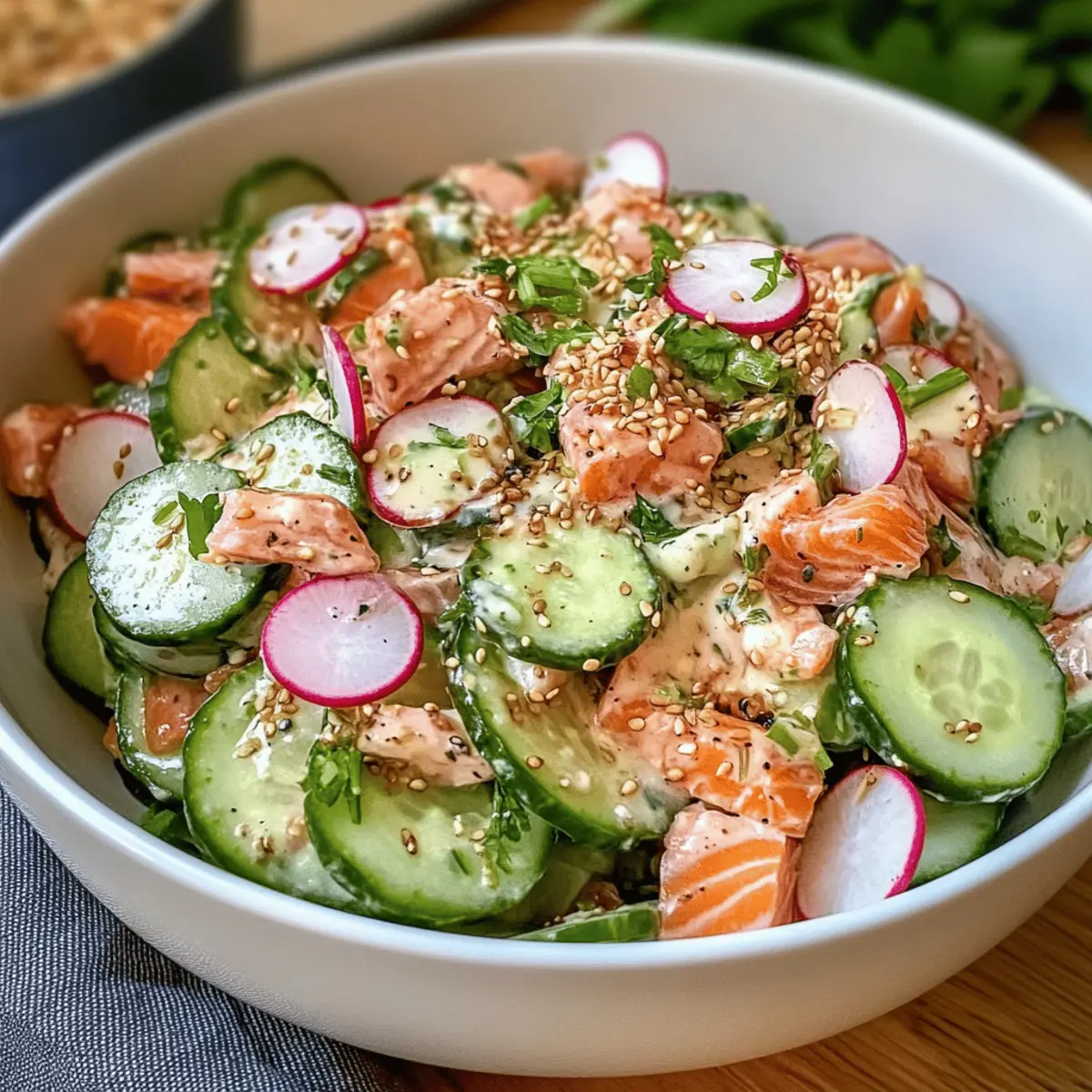 4. Gib die vorbereiteten Gurken, Radieschen, roten Zwiebelringe und den Stremellachs in eine große Rührschüssel. Füge die gerösteten Sesamsamen hinzu.