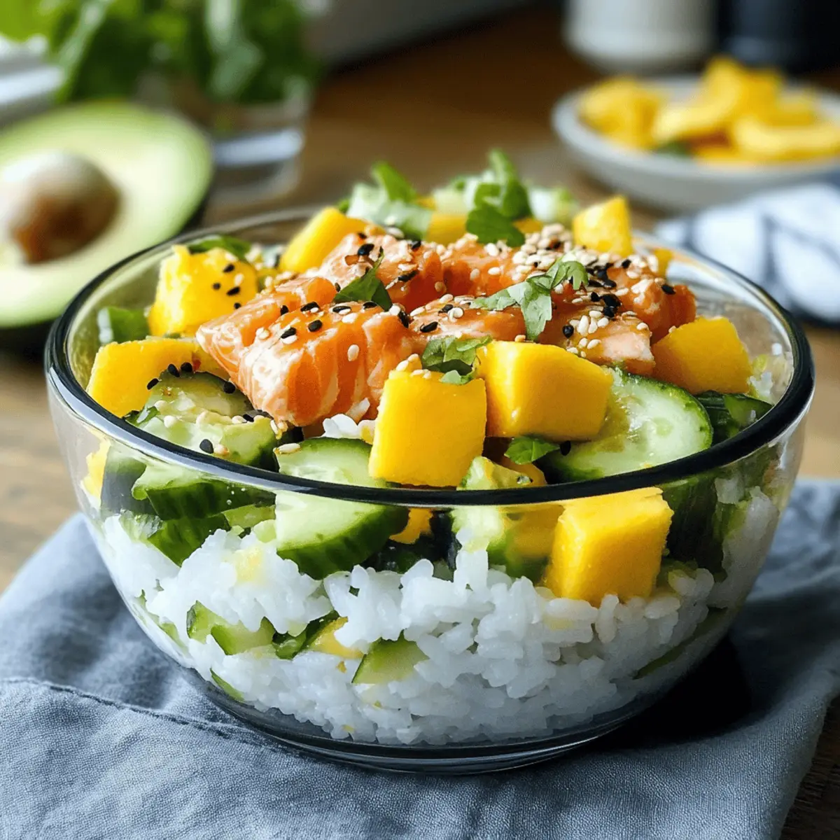 Der Sushi-Salat ist perfekt für die Vorbereitung, um dir wertvolle Zeit an geschäftigen Abenden zu sparen! Du kannst den Sushireis bis zu 24 Stunden im Voraus kochen und mit Reisessig, Zucker und Salz würzen, um den frischesten Geschmack zu bewahren. Auch die geschnittenen Gemüse wie Avocado, Gurke und Mango lassen sich vorab vorbereiten; jedoch solltest du die Avocado erst kurz vor dem Servieren hinzufügen, um das Braunwerden zu verhindern. Lagere die vorbereiteten Zutaten in separaten luftdichten Behältern im Kühlschrank, damit sie frisch bleiben. Wenn du bereit bist, servierst du einfach die gekühlten Zutaten zusammen, vermischst sie in einer Schüssel mit dem Lachs und dem Dressing, und schon hast du einen köstlichen Sushi-Salat, der gleich nach der Arbeit fertig ist!