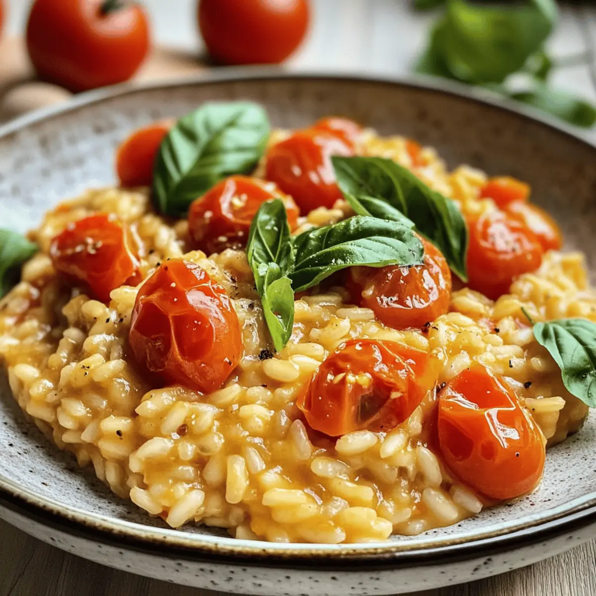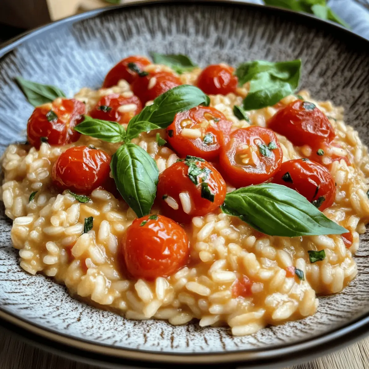 Einfachheit bedeutet: Dieses Rezept ist unkompliziert und benötigt nur grundlegende Kochfähigkeiten, perfekt für alle, die auch an hektischen Tagen leckere Hausmannskost zubereiten möchten. Reiche Aromen: Die süßen Kirschtomaten und die herzhaften Noten der Parmesanrinde sorgen für ein harmonisches Geschmackserlebnis. Vielseitigkeit: Ob als Hauptgericht oder Beilage, der Tomatenrisotto passt zu vielen Anlässen. Farbenfroher Genuss: Die leuchtenden Farben machen das Gericht zum echten Blickfang auf deinem Tisch. Lass dir nicht entgehen, wie du mit frischem Basilikum und hochwertigem Parmesan jeden Löffel zu einem Genuss machst!