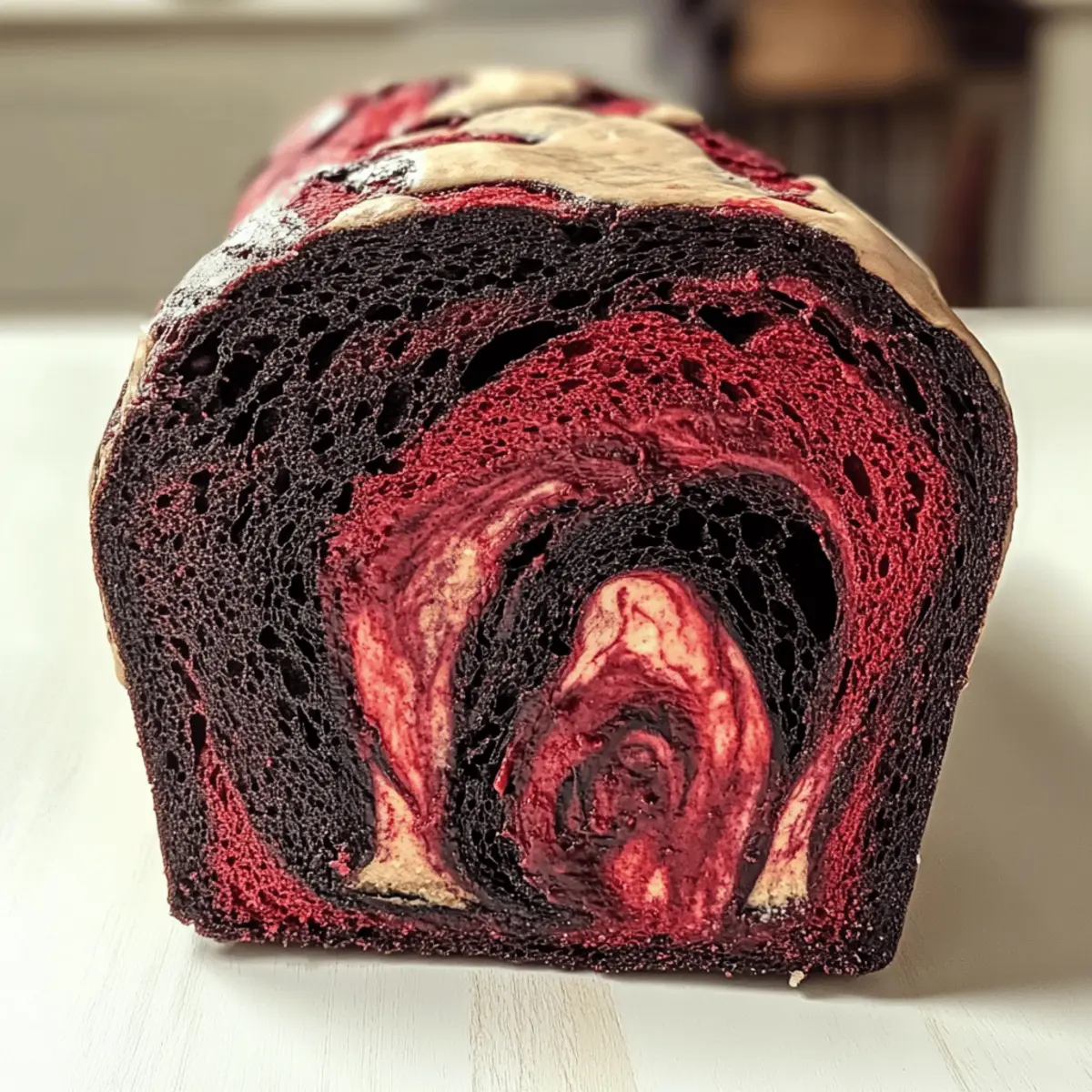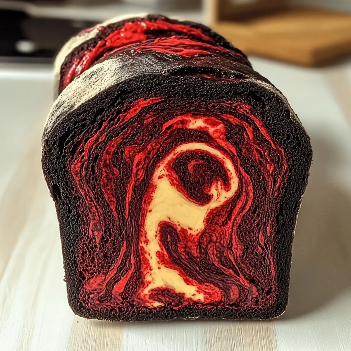 Einzigartiges Design: Die marmorierten roten und schwarzen Farbschichten machen dieses Brot zu einem echten Hingucker auf jeder Halloween-Feier.