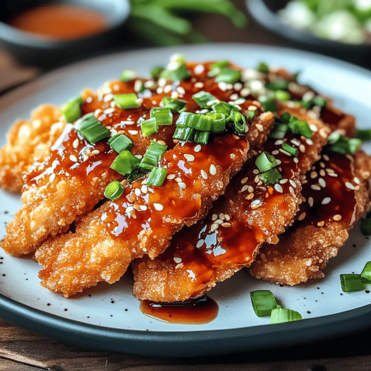 Serviere die knusprigen Hähnchenstücke auf einem Teller und träufle die würzige Sauce darüber. Du kannst es nach Belieben mit Sesamsamen oder gehackten Frühlingszwiebeln garnieren. Diese Kombination macht dein Gericht nicht nur lecker, sondern auch optisch ansprechend!
