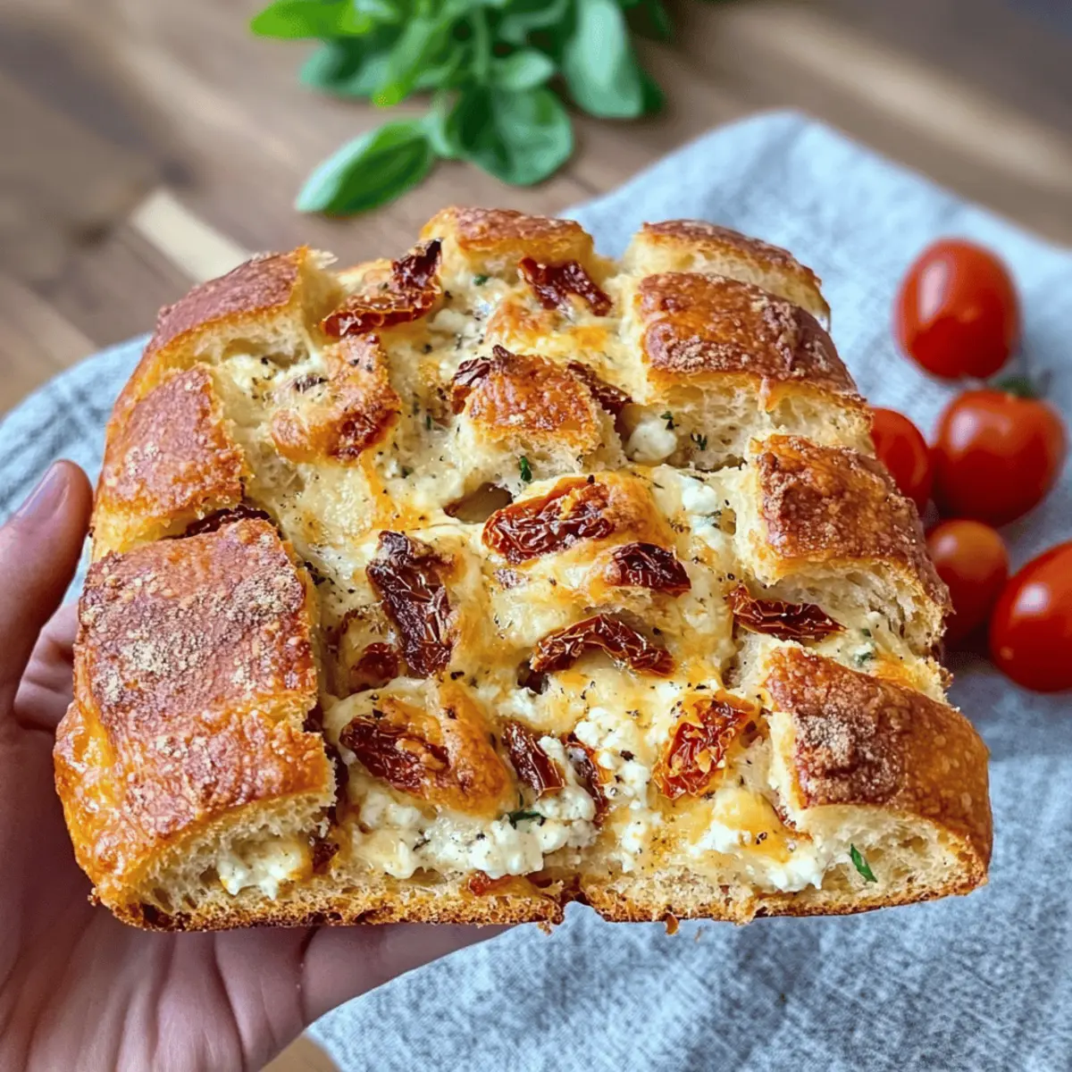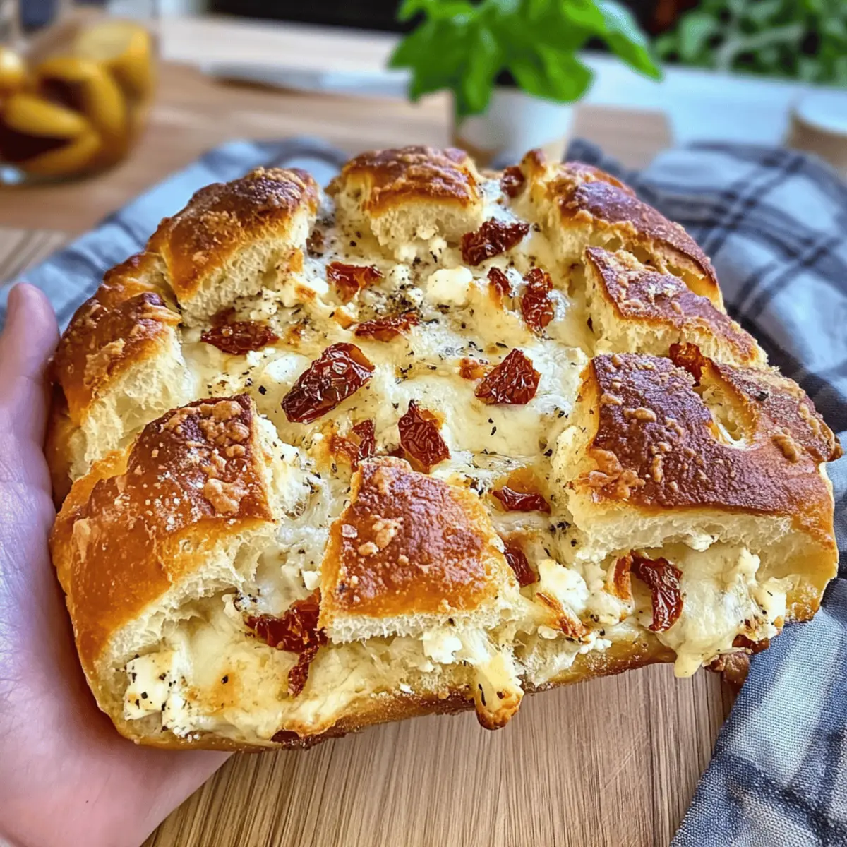 Ein köstliches Zupfbrot mit getrockneten Tomaten, Feta und Mozzarella, perfekt als Snack oder für Feiern.